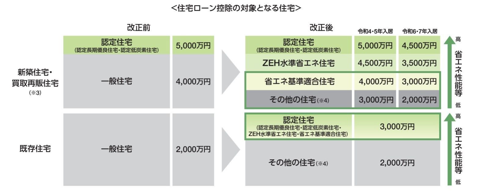 ※1 「認定住宅等」とは、認定長期優良住宅・認定低炭素住宅、ZEH水準省エネ住宅、省エネ基準適合住宅のことを指しており、2050年カーボンニュートラルの実現に向けた措置として、省エネ性能等の高い「認定住宅等」につき、新築住宅等・既存住宅ともに、借入限度額を上乗せされるようになりました。また、令和6年以降に建築確認を受けた新築住宅につき、省エネ基準への適合が要件化されます。つまり、令和6年1月1日以降、一定の省エネ基準を満たさないものの新築や既存住宅を購入されても、適用の対象外とされますので、ご注意ください。