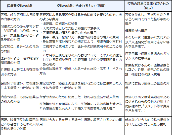 医療控除の対象となる「医療費」については、国税庁のホームページの図表にまとめられています。